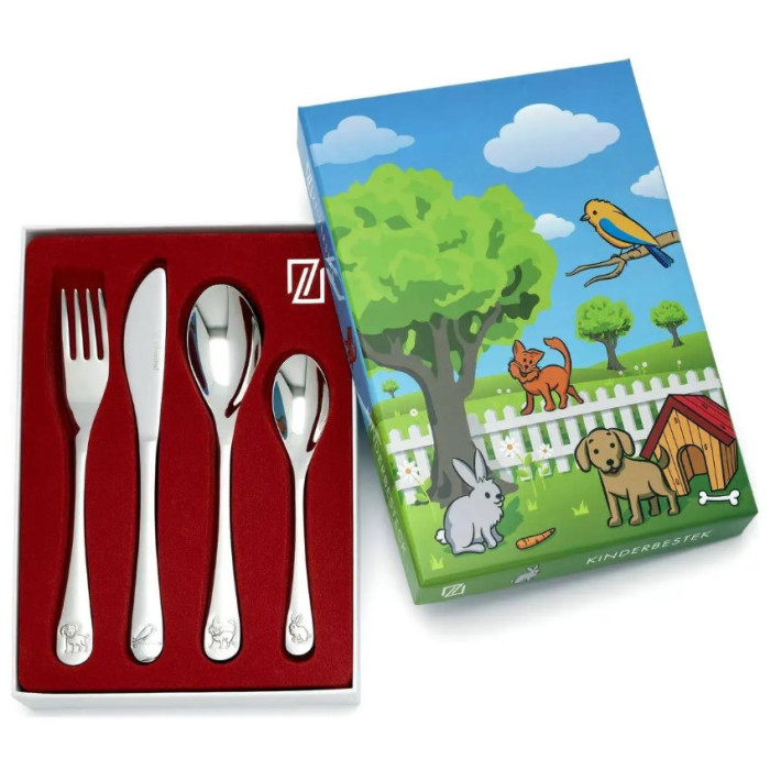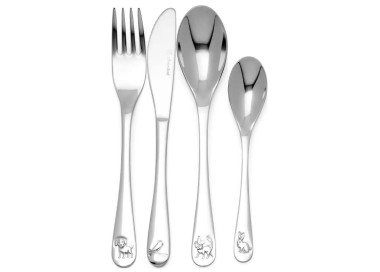 Zestaw 4 elementów, widelec (17cm), nóż (18cm), łyżka (17cm), mała łyżeczka (13,5cm). Sztućce pięknie zdobione zwierzakami. Zapakowane w kolorowe, tekturowe pudełko. Sztućce ze stali nierdzewnej 18/10 do grawerowania, nadają się do mycia w zmywarce.