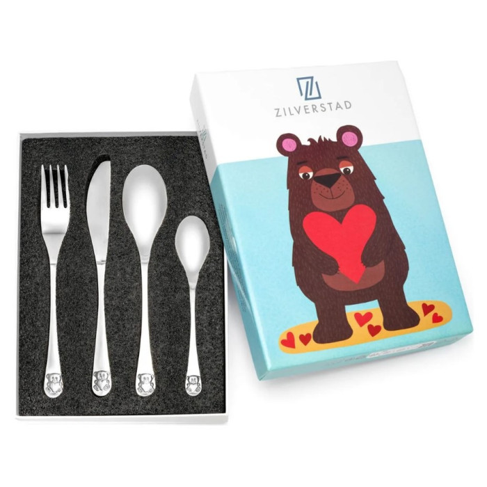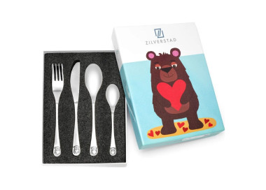 Zestaw 4 elementów, widelec (17cm), nóż (18cm), łyżka (17cm), mała łyżeczka (13,5cm). Sztućce zdobione misiem z serduszkiem. Zapakowane w kolorowe, tekturowe pudełko. Sztućce ze stali nierdzewnej 18/10 do grawerowania, nadają się do mycia w zmywarce.