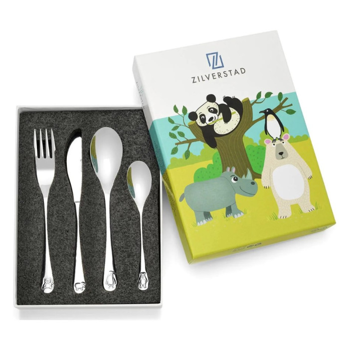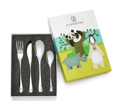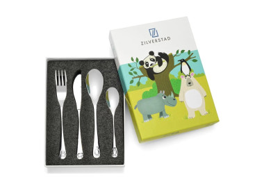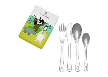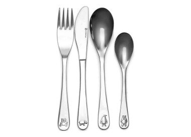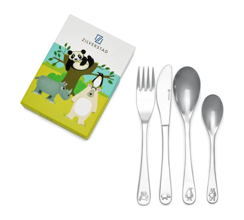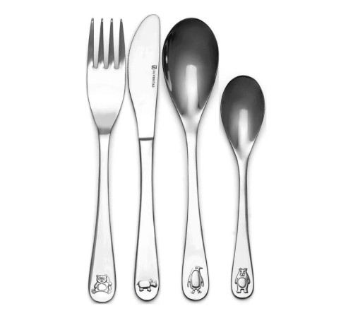 Zestaw 4 elementów, widelec (16cm), nóż (17cm), łyżka (16cm), mała łyżeczka (13cm). Sztućce zdobione elementami zwierzaków. Zapakowane w kolorowe, tekturowe pudełko. Sztućce ze stali nierdzewnej 18/10 do grawerowania, nadają się do mycia w zmywarce.