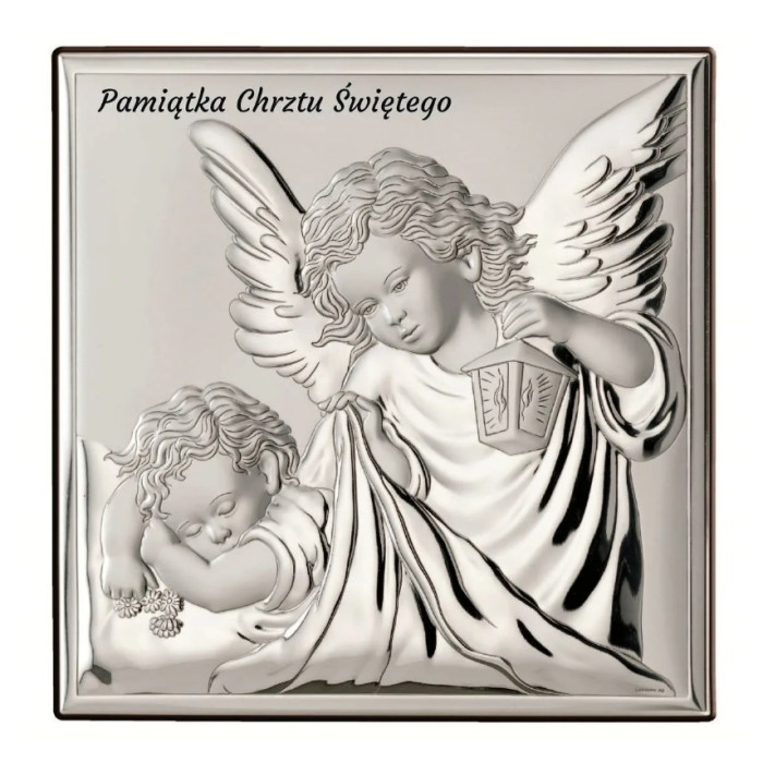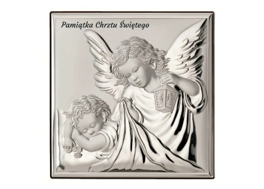 Pamiątka z okazji Chrztu Świętego. Obrazek posrebrzany przy użyciu technologii PVD (Miro-Silver) z grawerowanym napisem na emblemacie.